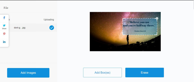Click on the Add Box icon. Select the texts and watermark areas. Click the Erase button to remove the unwanted text.