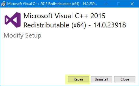 Solution 3: Repair installed Visual C++ 2015 Redistributable package.