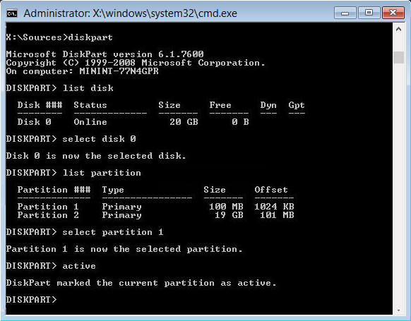 Step 2: Now in the command window type diskpart. Then write the following commands-