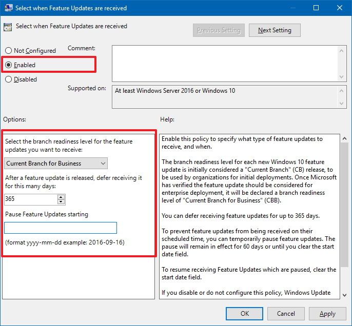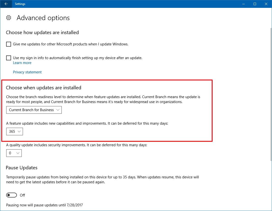 Step 2- Choose when updates are installed > Current Branch/Current Branch for Business.