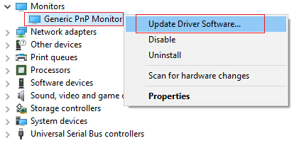 Expand Monitors > right-click on Generic PnP Monitor > Update Driver.