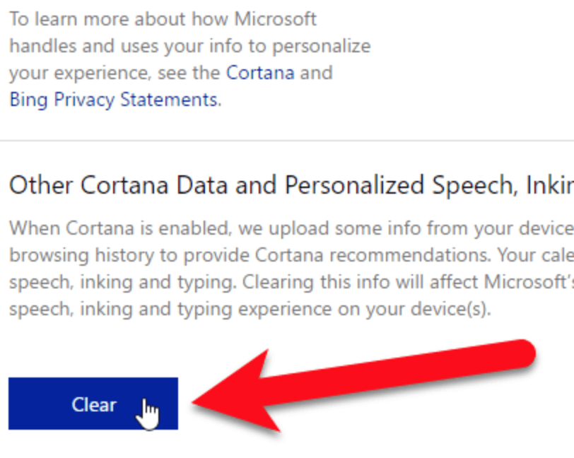 Step 3: Scroll down to the Other Cortana Data and Personalized Speech, Inking and Typing > click Clear.