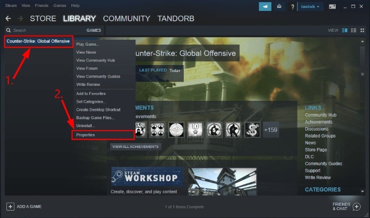 - Select Library and then right-click on CSGO. Select Properties.