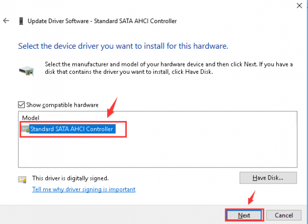 Step 9- Look for Standard SATA AHCI Controller from the list and choose it. Then press Next to continue and complete the rest of the procedure as instructed.
