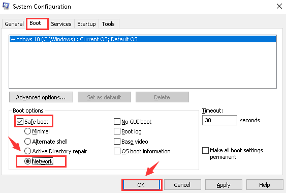 Step 2- In that box look for the Boot tab and under boot drop-down menu tick on Safe mode option. Choose Network and then click Ok to continue.