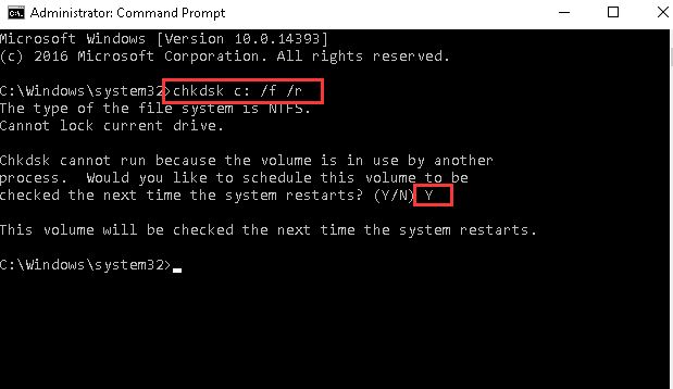 Step 3- A command window will open, type in the box the command as chkdsk c: /f /r. Hit the enter button. Then type Y so that you check it again when you next start the computer.