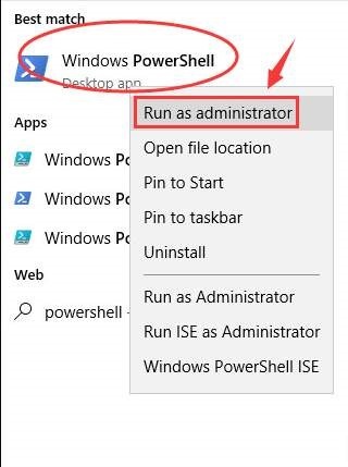 Step 1: Click on Start and in the search box, type PowerShell. From the list of results displayed, right click on Windows PowerShell. Then choose Run as administrator.