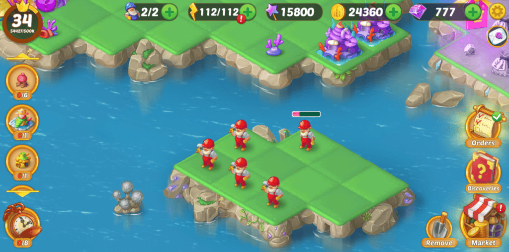 Each red gnome has an hour of boost time. You can drag a red gnome onto a bunch of buildings that take five minutes to build to speed up and merge them, which allows you to have new discoveries and clean up more space. When the red gnome is running out of acceleration time, you can assign him a long building timer, and he will finish that building, freeing your red gnome. Red gnomes can be planted with a hammer or purchased from the market.