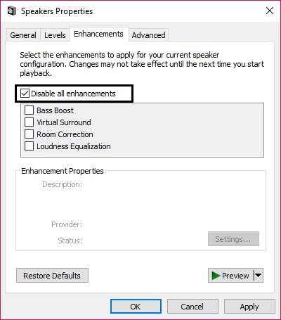 Step 3- Go to Enhancements > mark the option Disable all enhancements.