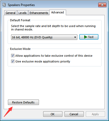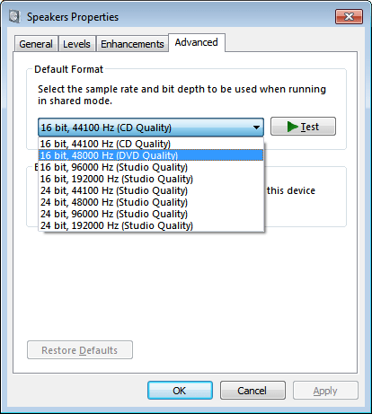 Step 4- Click on Advanced change sample rate to another sample such as 16 bit, 48000 Hz.
