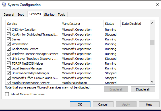 Solution 4: You can try to disable all Microsoft services. To do that, open Run and type msconfig. Uncheck all the Microsoft Services and restart your computer.