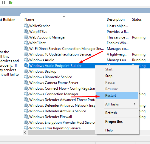 Step 4: Now, again you have to go back to the service tab and from there right-click on the Windows Audio Endpoint Builder option and click on the Restart. If it does not restart then you have to click on the Start option.