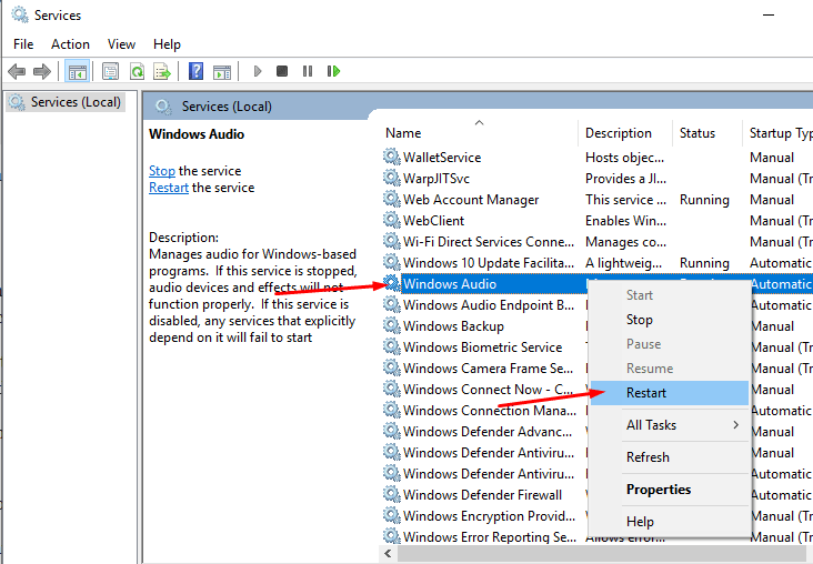 Step 2: Now when you are reached to the Services tab then here you have to find the Windows Audio and after that right-click on it from there you have to select the Restart option.