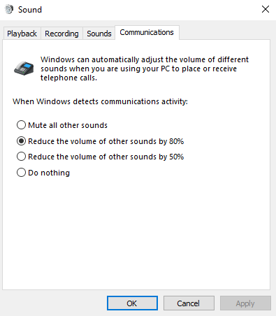 Open the “Audio” settings window. Find Taskbar and right click on a Sound icon. Go to Communications tab.