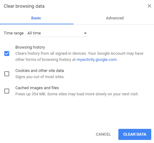 2. Click on clear browsing data and then select Clear Browsing history, cache, and cookie.