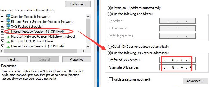 3. Click on Internet Protocol Version 4(TCP/IPv4) and enter following DNS as shown in an image > Ok.