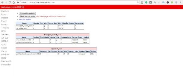 chrome://net-internals/#sockets and press Enter. You will observe a screen like below.