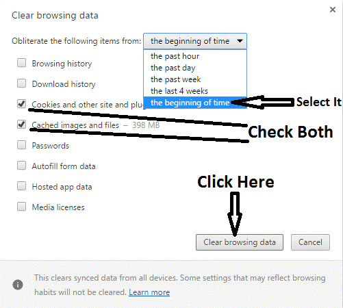 Step 5: Set “Obliterate the following items” option to “the beginning of time.”