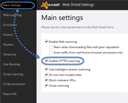 If you have Avast or any other antivirus security software, then you can try this method. But while adding the sites make sure that the URL’s are correct. Otherwise, the problem does not resolve. You can also try fixing the error by disabling the HTTPS Scanning after opening Avast Web Shield. Click on Main Setting and click on the checkbox beside Enable HTTPS Scanning.