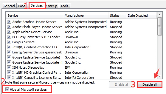 Step 2: Click Services > check the box “Hide all Microsoft services” > Disable all option.