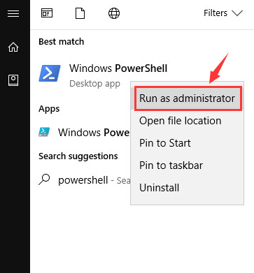 Step 2: Now right-click on the Windows PowerShell and choose Run as administrator option.