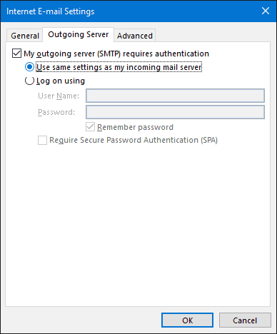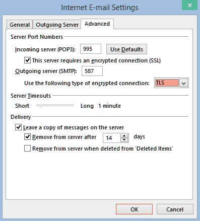 Step 4. An internet email settings will appear. Go to advance tab and then change outlook server port number to 587. Click OK.