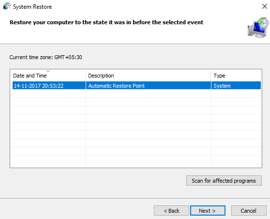 Step 3: Select a System Restore and Next.