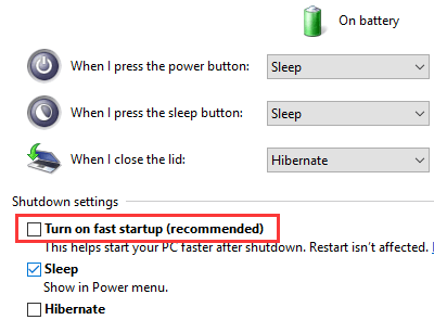 Step 4: Uncheck the box against Turn on fast startup option. Save the Changes.