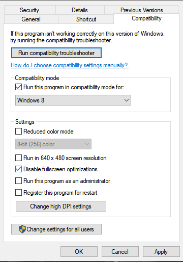 - Select Windows 8 and disable full-screen optimizations.