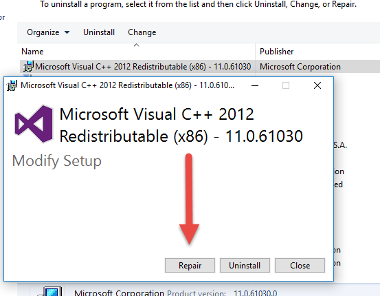 - Run the installers and choose the Repair option. If there is no Repair option, then click on Install.