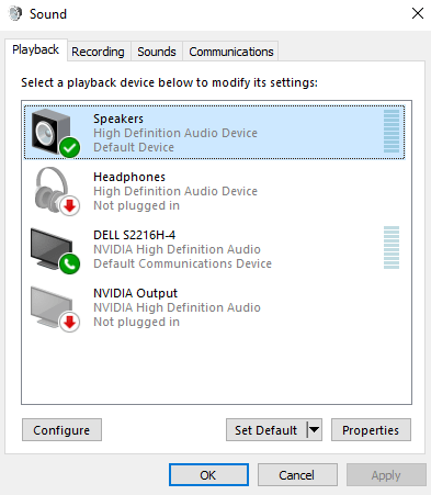 Step 4: Click the Playback > speakers/headphones you’re using > Set Default.