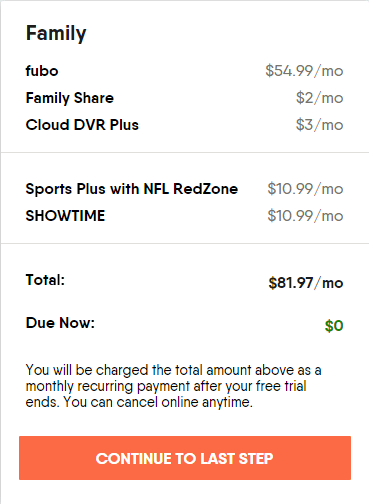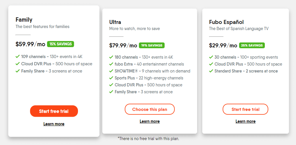 Apart from the free FuboTV Trial, they have three main plans. The Standard plan the Family plan, and the Ultra plan. You can also purchase add-ons.