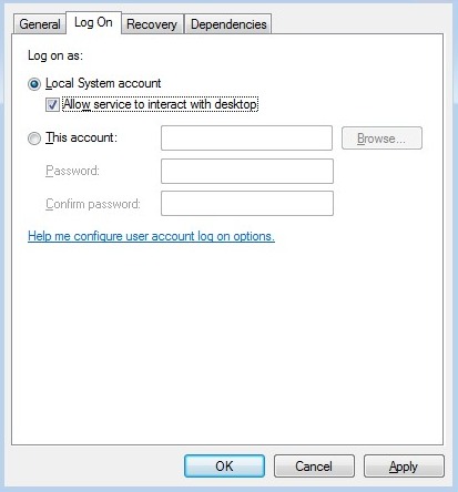 Step-3: Next, switch to the “Log On” tab. Find the “Allow service to interact with desktop” box and check it (if it is unchecked).