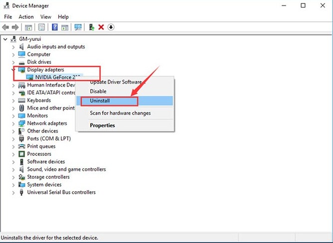 Step-4: In the Device Manager, expand Display adaptors, right-click on the GPU, and select Uninstall device.