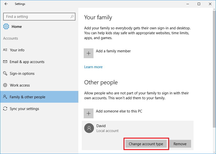 Solution 1: Change a user account type on Settings