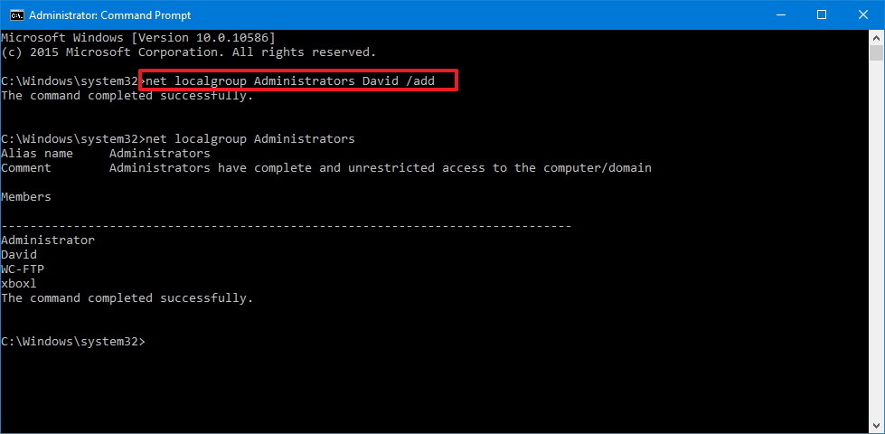 Step 2: Write down the following command to change the account type to Administrator and then press Enter: net localgroup Administrators “account-name” /add