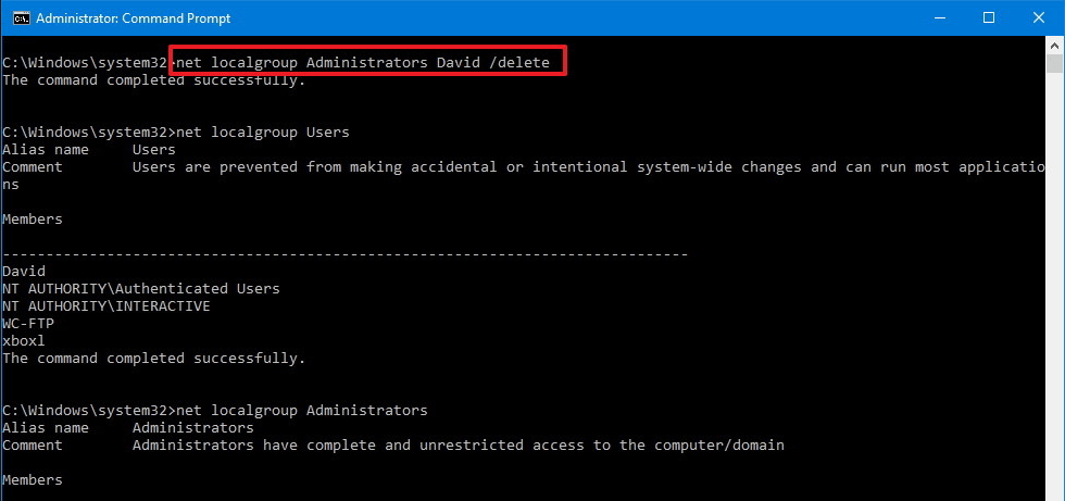 Step 3: You can type the following command to change the account type to Standard User and then press Enter: net localgroup Administrators “account-name” /delete