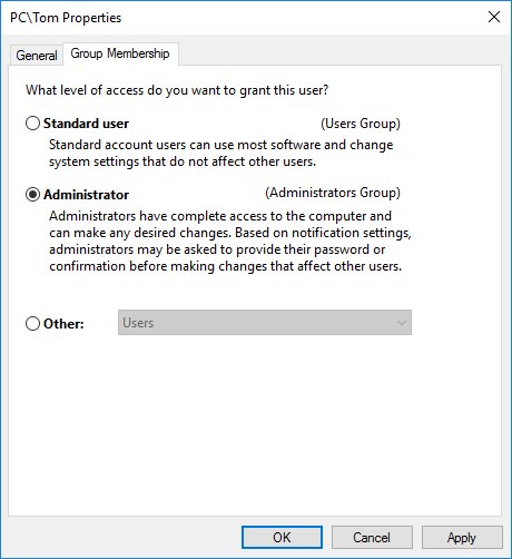 Step 3: Now, select the Group Membership Tab. Choose the type of account which you are using. Whether it should be Standard User or Administrator.