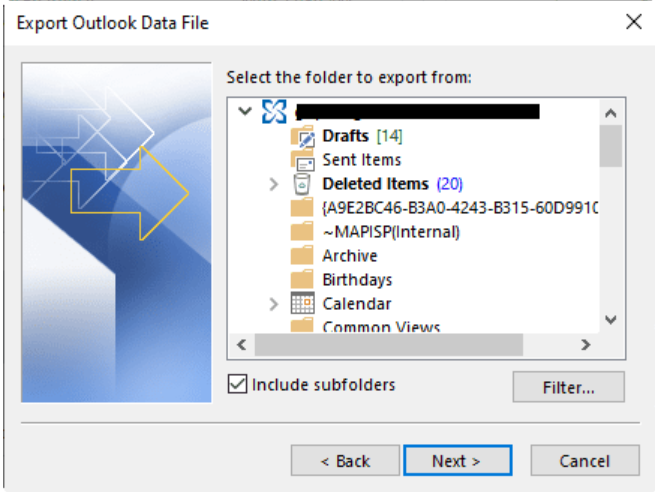 5. On the Export Outlook Data File window, select the folders you wish to export. You can select a mail account or individual mailboxes from the list.