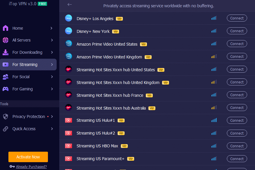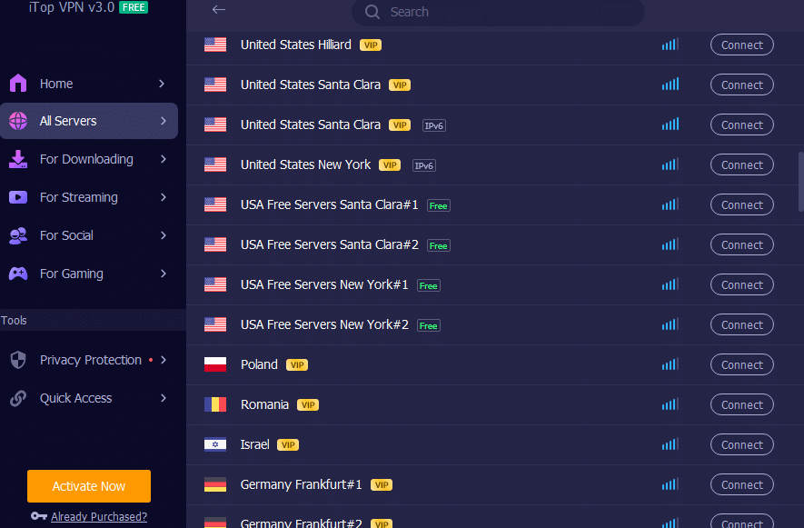 iTop VPN provides fast speeds without limiting internet consumption. It is also an uttermost delight for all users because they have 1,800+ servers in 100+ places. If someone is experiencing slow connectivity, they can connect to a fast VPN server by switching to a different server in a different or exact location.