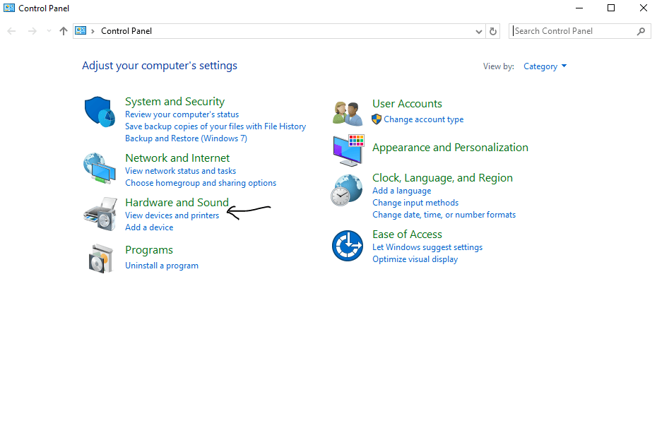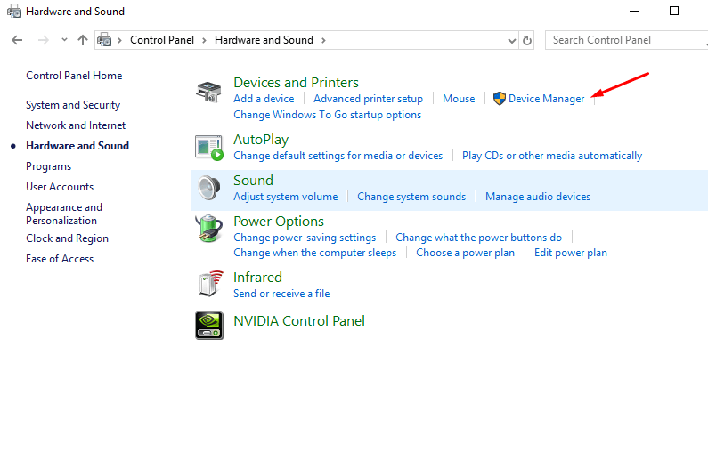 Step 2: Then go to Hardware and Sound from the left side window and then Device Manager under Devices and Printers.