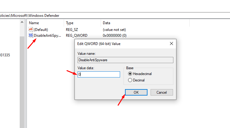 Step 3: Now right click on the DisableAntiSpyware key > modify > and change the value from 1 to 0.