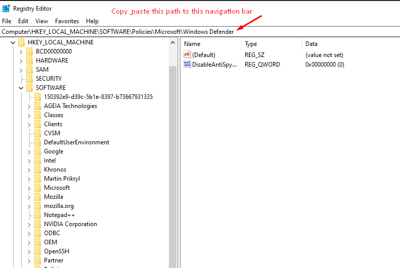 Computer\HKEY_LOCAL_MACHINE\SOFTWARE\Policies\Microsoft\Windows Defender