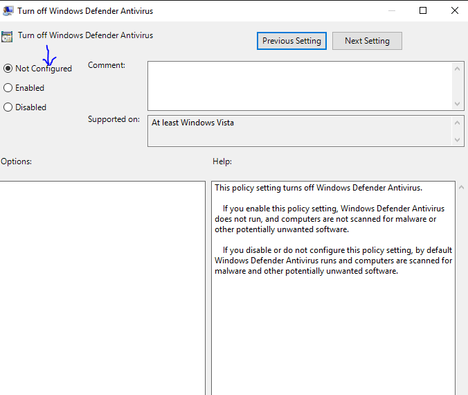 Step 4: Double click > Turn off windows defender antivirus > select Non-Configured.