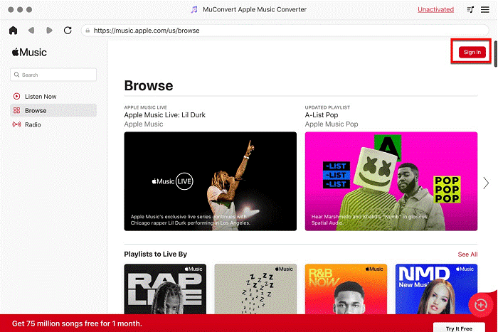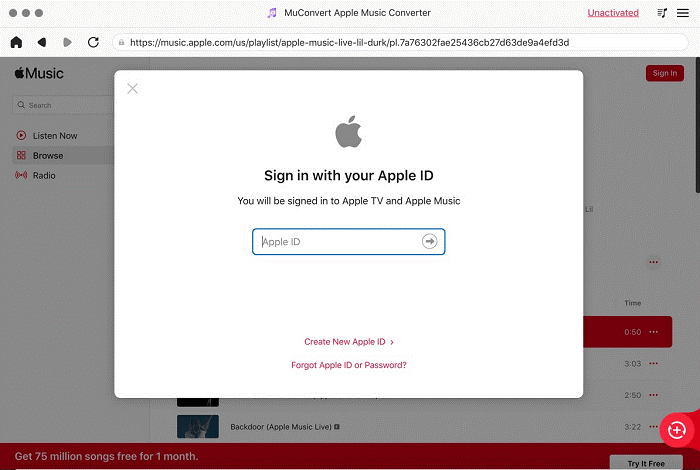 STEP 1. Launch MuConvert Apple Music Converter and submit to enter the main interface of the built-in Apple Music web player. Then, you need to log in to your Apple ID to access the library and also the download functionality.