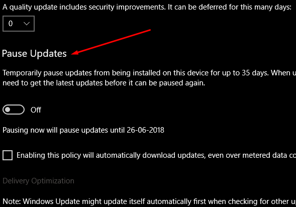 4. Turn on Pause Updates to pause updates in Windows 10. This will pause Windows 10 updates for 35 days.