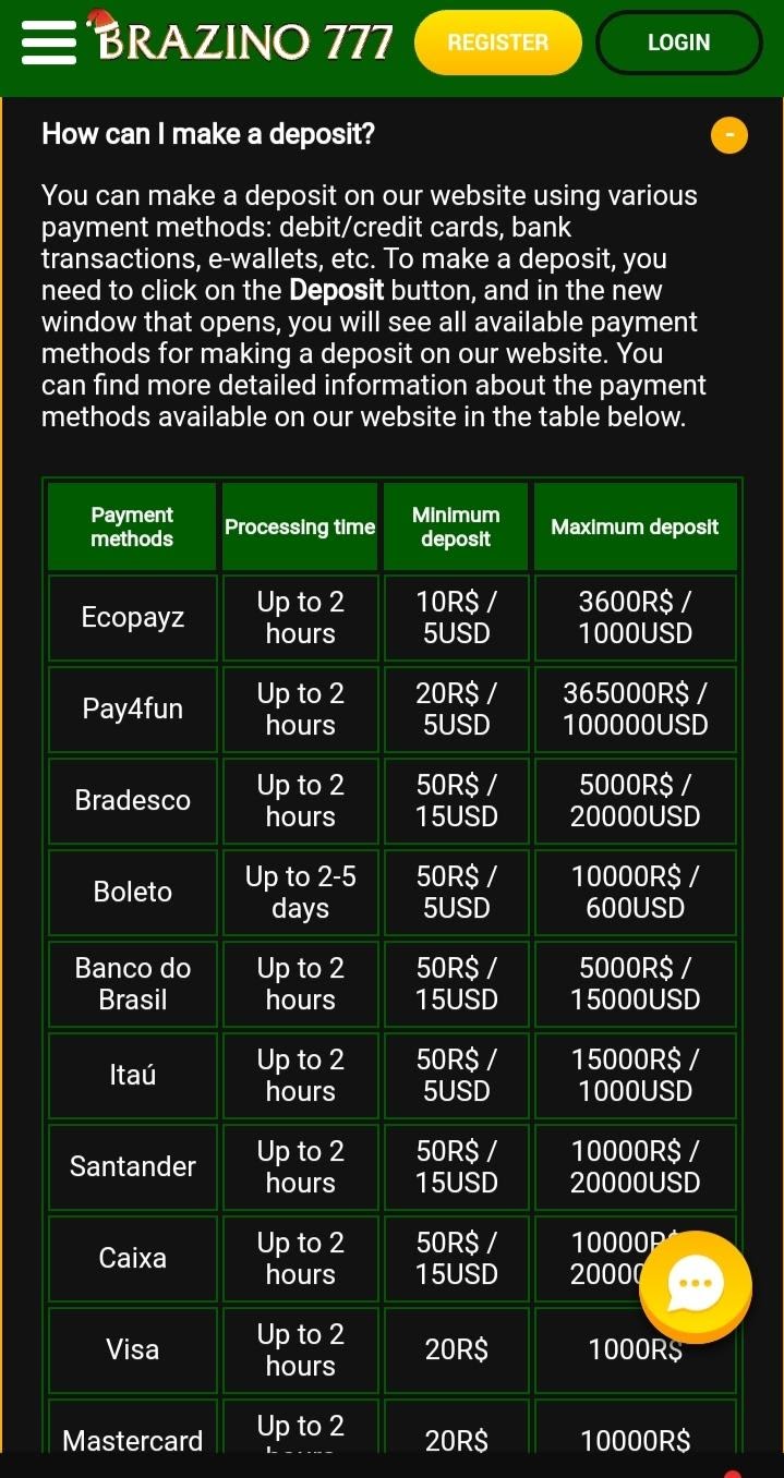 Withdrawal methods in Brazino are a bit restricted when compared to the deposit methods that the site offers. These methods for withdrawal include Bank wire transfer, Bradesco, Pay4fun, Ecopayz, Skrill, Caixa, and Santander. The waiting days for withdrawals usually range from one to six days, after the withdrawal is activated. For deposits, however, transactions take up to two hours maximum.