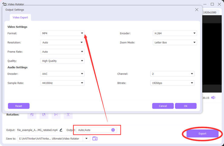 Step 3: Click the Output option with a gear icon. Choose a format for your output video or adjust other settings like bitrate. Then, choose a destination folder via the Save To option. Click the Export button to save the video.