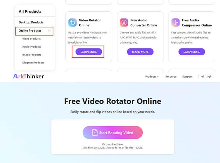 Step 1: On the official website of ArkThinker, click the Product menu and go to Online Products section. Find Free Rotator Online and click the Learn More button to enter it. Once on the rotator page, click the Start Rotating Video button to upload your video. The uploading speed depends on the file size.