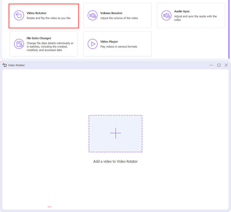 Step 1: Get a free download of the program on ArkThinker’s official website. Install and launch it afterward. Go to Toolbox, open the Video Rotator tool, and click the plus icon to select a video file to import into the program.